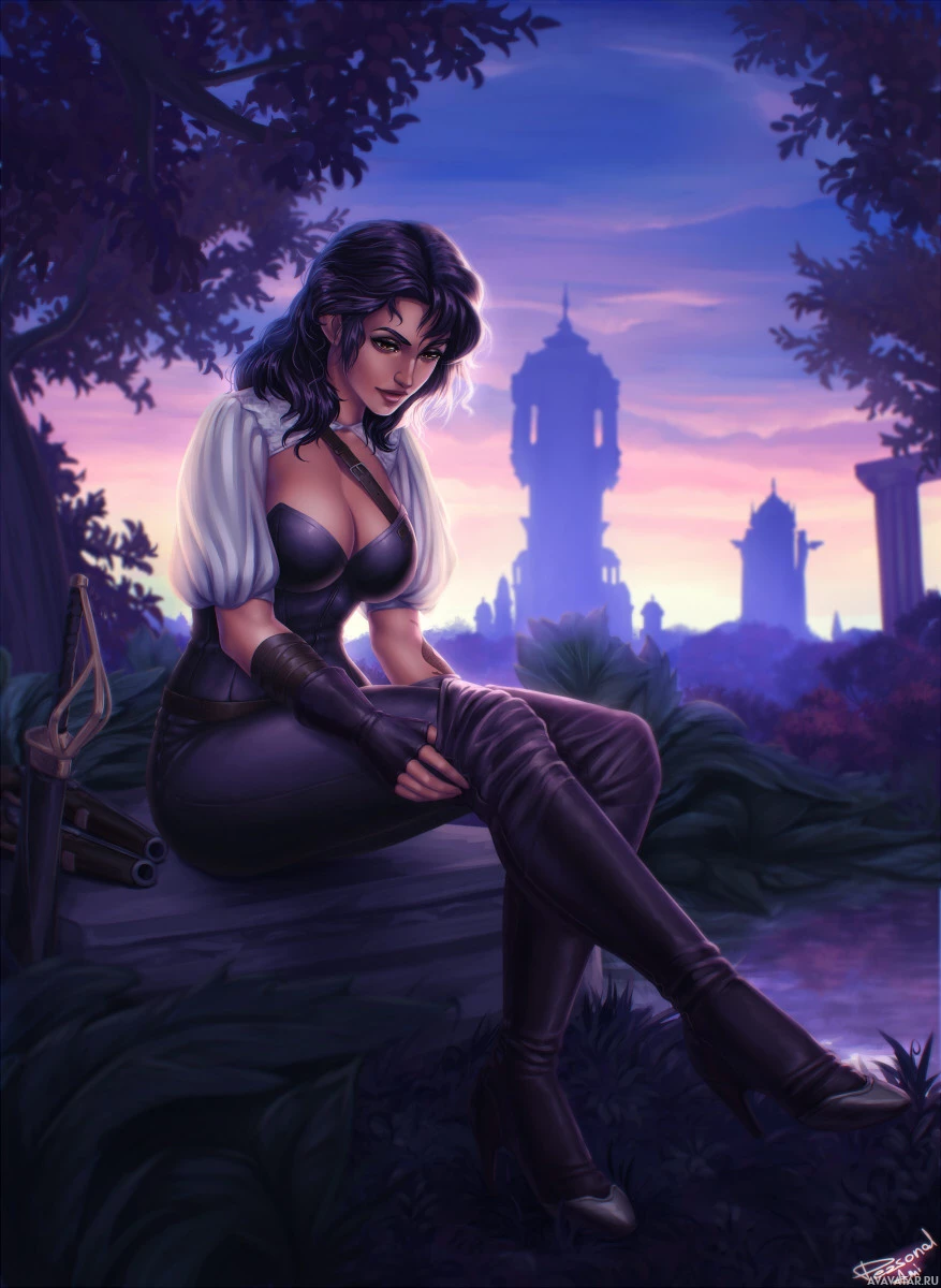 dark hair, wears armor and boots, and is equipped with what looks like a quiver on her back. There are silhouettes of