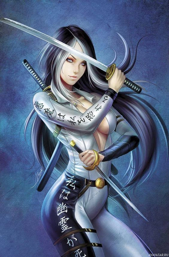 a female character with long, dark hair. She is dressed in an outfit that resembles traditional Japanese armor, complete with a sword on her waist and what appears to be kanji characters on the outfit. Her pose suggests she is ready for combat or practicing