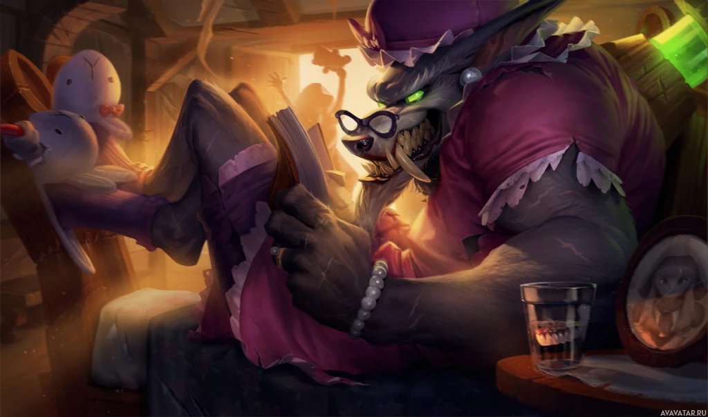an illustrated scene featuring anthropomorphic creatures that resemble wolves. The setting appears to be a room with a cozy, lived-in feel, possibly a study or living area. In the foreground, there's a wolf character wearing glasses and