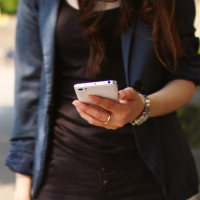 The image shows a woman who appears to be focused on her smartphone. She is standing outdoors, and the lighting suggests it might be daytime. The image has been edited to include