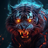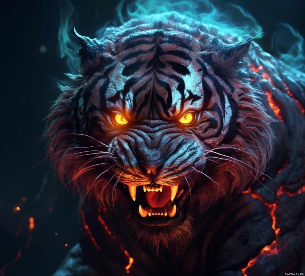 Картинка показывает измененное в цифровом виде или художественно визуализированное изображение тигра. Это не настоящая фотография, а скорее произведение цифрового искусства, которое сочетает в себе такие элементы, как пламя и темный фон, чтобы создать фантастический или драматический эффект.