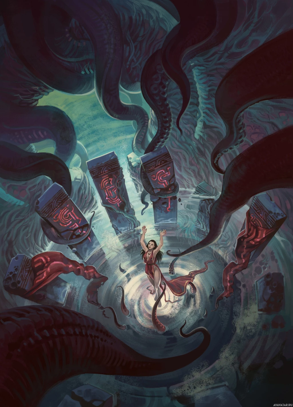underwater setting, with the presence of what appears to be ancient structures or artifacts. The artwork is richly detailed and has