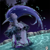 The image depicts an animated character, a drow female with long purple hair and what appears to be a magical or fantasy setting. She is seated on rocks near water, and there are celestial bodies like stars and possibly the moon in the sky above her. The overall atmosphere of the image is serene and enchanting, fitting within the genres of fantasy and animation.