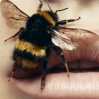 The image shows a close-up of a person's lips, with a bee (specifically, a bumblebee) resting on them. This is an artistic or symbolic representation rather than a real-