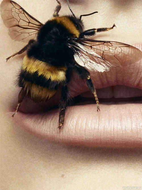 life scenario, as bees do not typically land on human lips. The image could be interpreted in