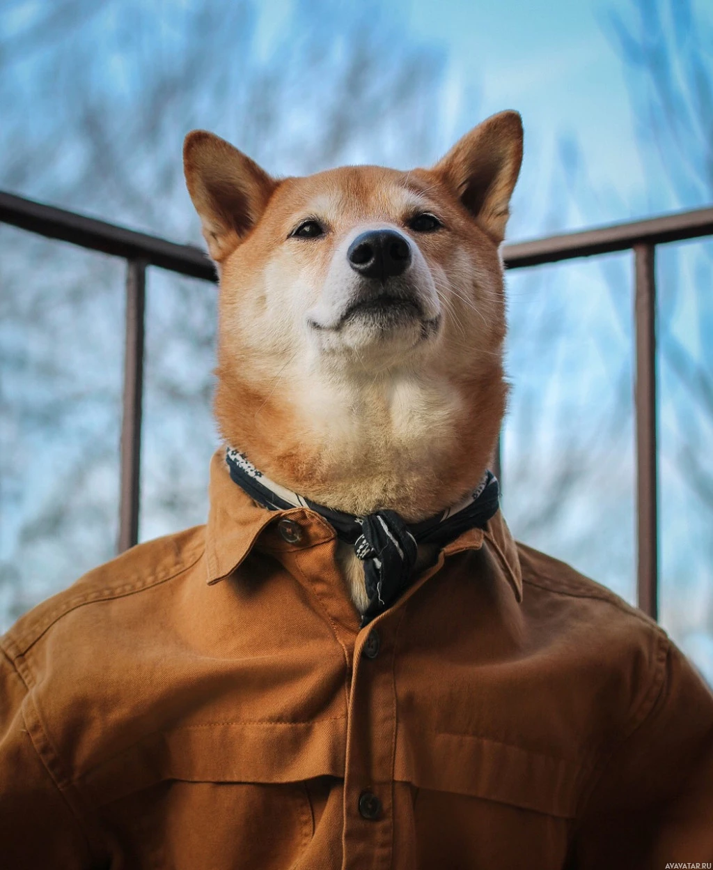 The image shows a dog, specifically a Shiba Inu, dressed in