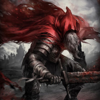 a large sword in their left hand. They are also wearing a red hood with long, flowing fabric that resembles blood or some kind of