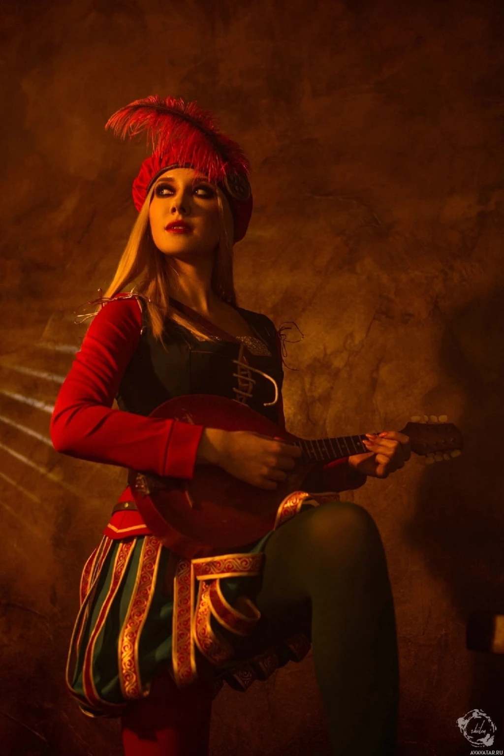 video games, such as "The Witcher" series, specifically resembling Priscilla. The individual is holding a guitar and appears to be in character while playing it. The lighting and setting give the image a moody and atmospheric feel, which could also imply a connection to