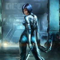 The image features a female character from behind. She has blue hair and is dressed in a futuristic, robotic suit with metallic armor parts and a sword attached to her waist or thigh area. Her pose suggests she may be ready for combat or action. The background includes industrial or sci-fi elements such as pipes, machinery, and what appears to be a control panel or console.