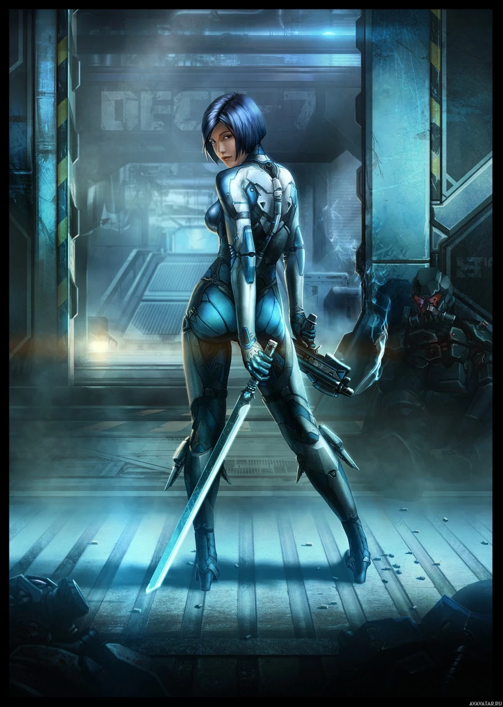 На картинке изображен женский персонаж сзади. Она имеет синие волосы и одета в футуристический, роботизированный костюм с металлическими частями брони и мечом, прикрепленным к ее талии или области бедра. Ее поза предполагает, что она может быть готова к бою или действию. Фон включает в себя промышленные или научно-фантастические элементы, такие как трубы, машины и то, что кажется панелью управления или консолью.