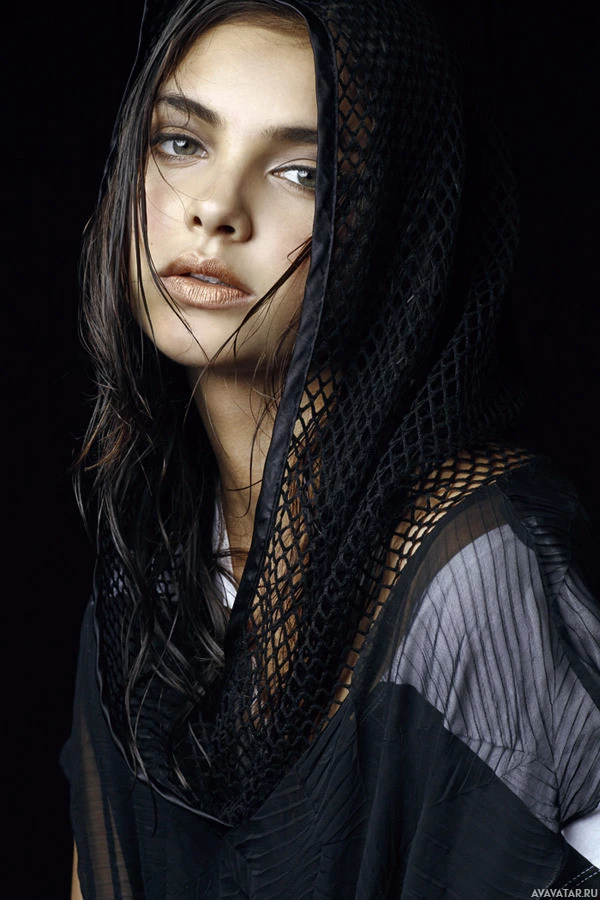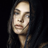 brunette hair. She is wearing a dark, textured top or garment that covers her head. Her expression and the overall mood of the photo suggest she might be experiencing rain or is just feeling contemplative in the weather. The colors are subdued, which adds to the moodiness of the image.