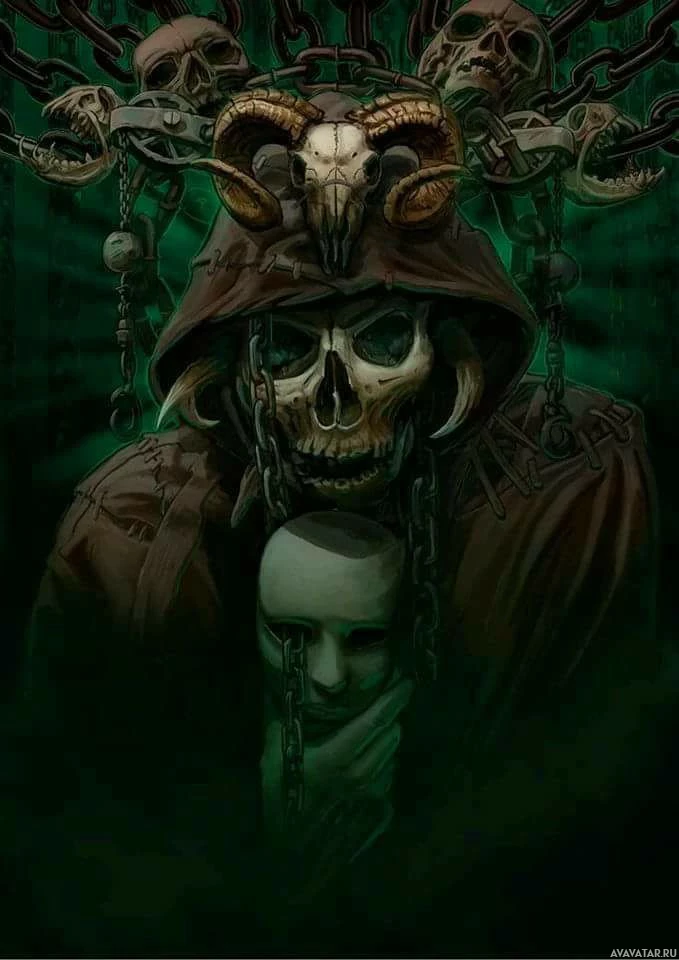 a hooded figure that resembles a skeleton. The figure is cloaked in black and has