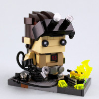 a Lego figure that resembles a character from a movie. It has human-like features, including eyes and a mouth, and is wearing what appears to be a helmet or headgear with a visor. The Lego figure is posed in an action-