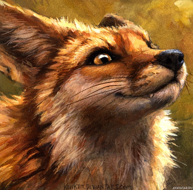 The image shows a fox, which is an animal. The fox appears to be looking upward and has its mouth slightly open, possibly mid-yawn or in the process of smelling something interesting above it. It is painted with attention to detail, highlighting its