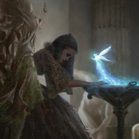 a fantasy setting. On the left side, there is an individual sitting down with their face obscured or turned away from the viewer. This figure is dressed in what looks like
