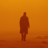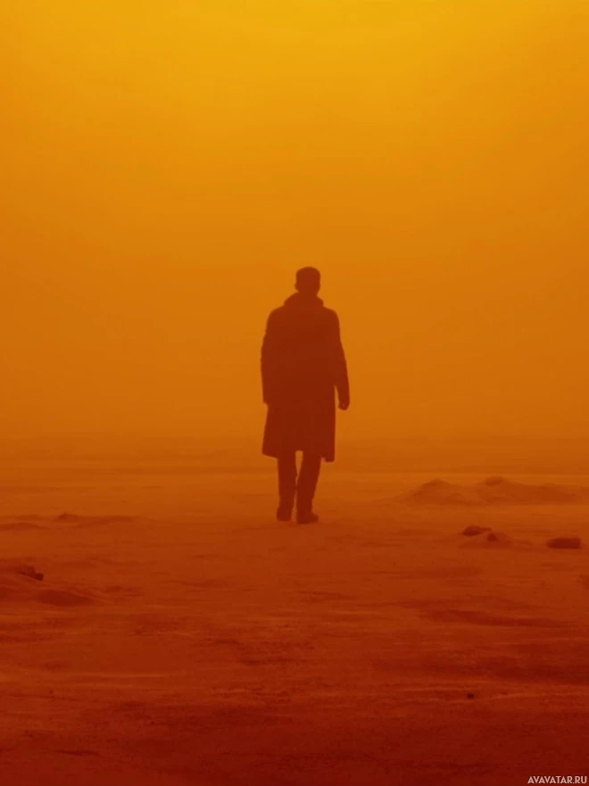 The image shows a person walking towards the camera from behind, silhouetted against an orange or red
