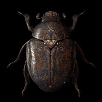The image displays a beetle with intricate patterns on its surface, resembling an ancient or historical artifact. The design and craftsmanship suggest that it might be made to look like a metal object from the past, possibly meant as a decorative piece or a piece of artwork.
