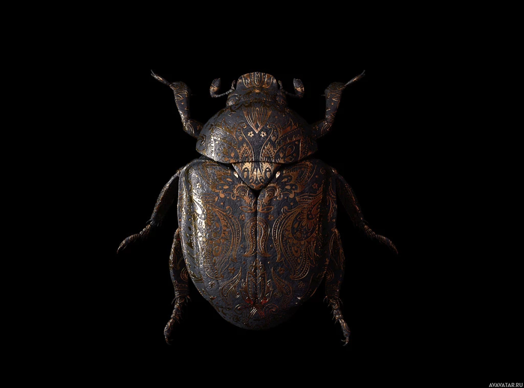 На картинке изображен жук с замысловатыми узорами на его поверхности, напоминающий древний или исторический артефакт. Дизайн и мастерство предполагают, что он может быть сделан похожим на металлический предмет из прошлого, возможно, предназначенный как декоративный предмет или произведение искусства.