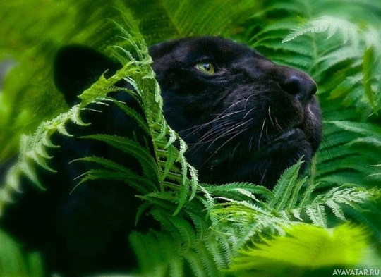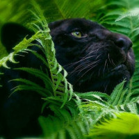 green foliage, likely ferns or similar plants, which suggests an environment like a rainforest or a dense jungle. The image captures the panther in its