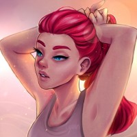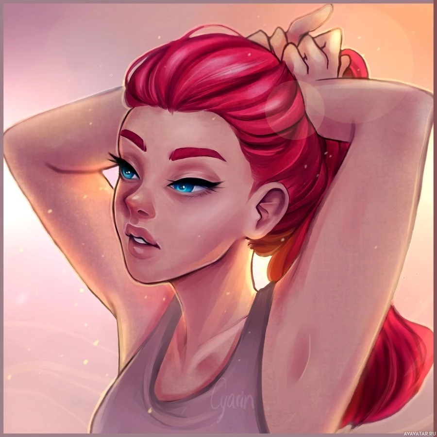 a female character with red hair, resting her head on one hand. She appears to be