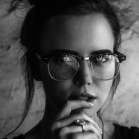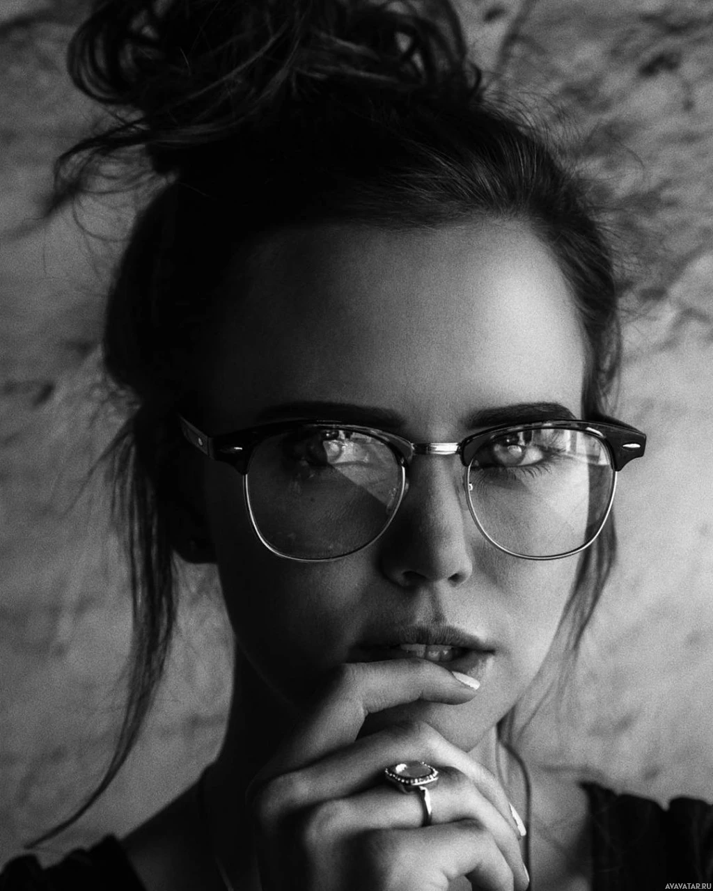 brunette hair and is wearing large, round glasses. Her eyes are focused on something in front of her, and she appears to be deep in thought. She's also wearing a necklace and a ring on her