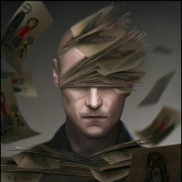 short hair and a serious expression. He is surrounded by flying papers that are filled with text and drawings, suggesting chaos or disorder. The background is neutral, focusing the attention on the man and the scattered