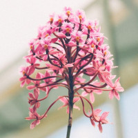 На картине изображен один розовый цветок с стройным стеблем. Это, по-видимому, тип лилии или радужной оболочки, возможно, орхидея, учитывая тонкую структуру и цвет. Фон размыт, но предлагает наружную обстановку с естественным освещением, которое подчеркивает мягкую текстуру лепестков и небольшие желтые тычинки на вершине цветка.
