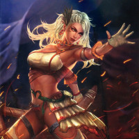 blonde hair and is making a dynamic pose that suggests she might be casting some sort of spell or attacking. Her attire is reminiscent of