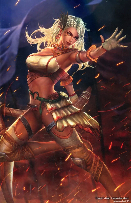 ancient warriors, possibly indicating her role as a warrior or mage within the game's universe. The background gives off a fiery atmosphere with explosive effects around her, adding to