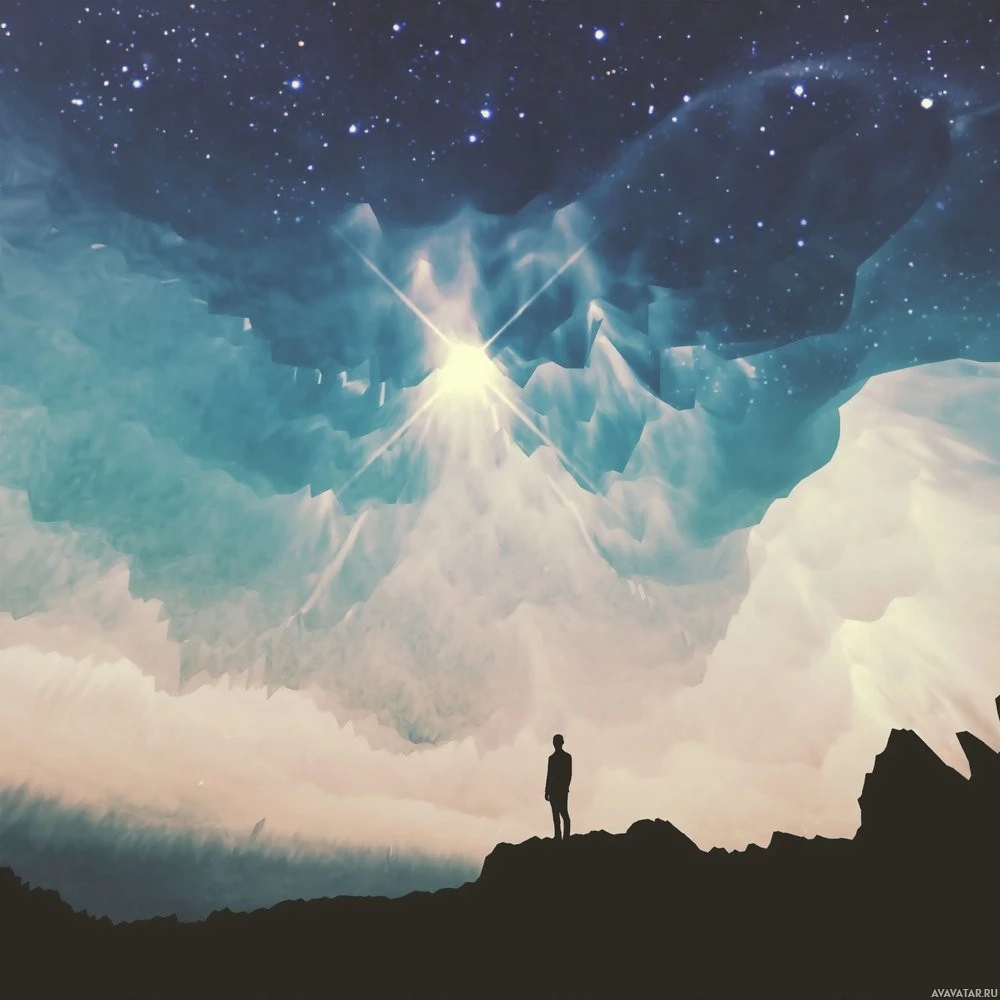 a night scene with a person silhouetted against the sky, standing on what appears to be a rocky outcrop or mountain. Above them is a vast cosmic view that includes a star-filled