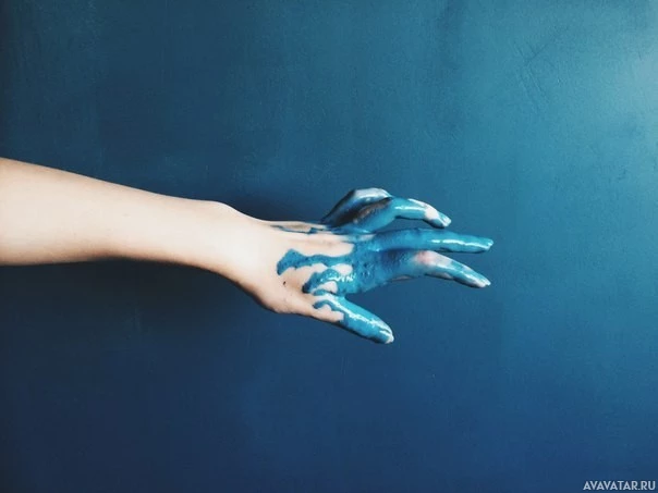 blue paint splattered on it, suggesting that the person was engaged in painting or has recently been involved in an activity involving paint. The background appears to be a light blue wall, which might indicate that this scene is taking place in