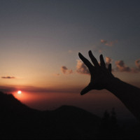 The image shows a silhouette of a person's hand and arm extended towards