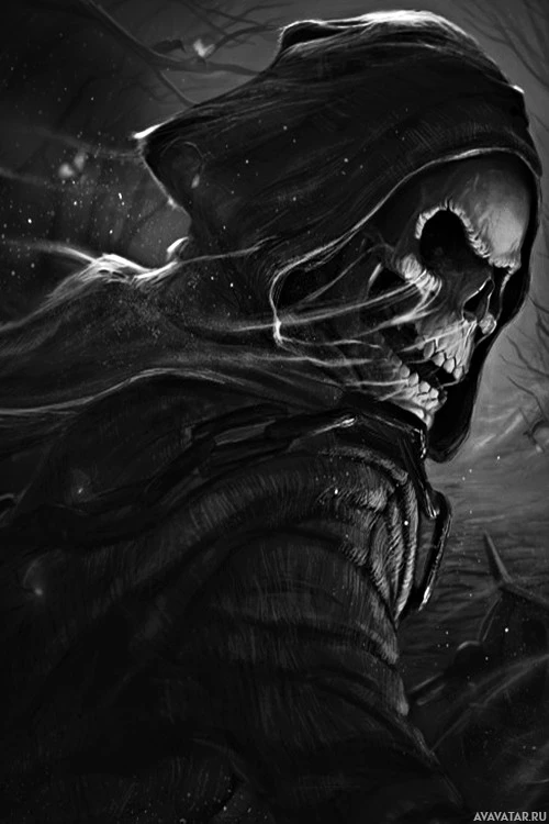 a hooded cloak and has a skeletal face, which contributes to the eerie atmosphere of the artwork. The overall tone of the picture suggests a dark, mysterious theme.