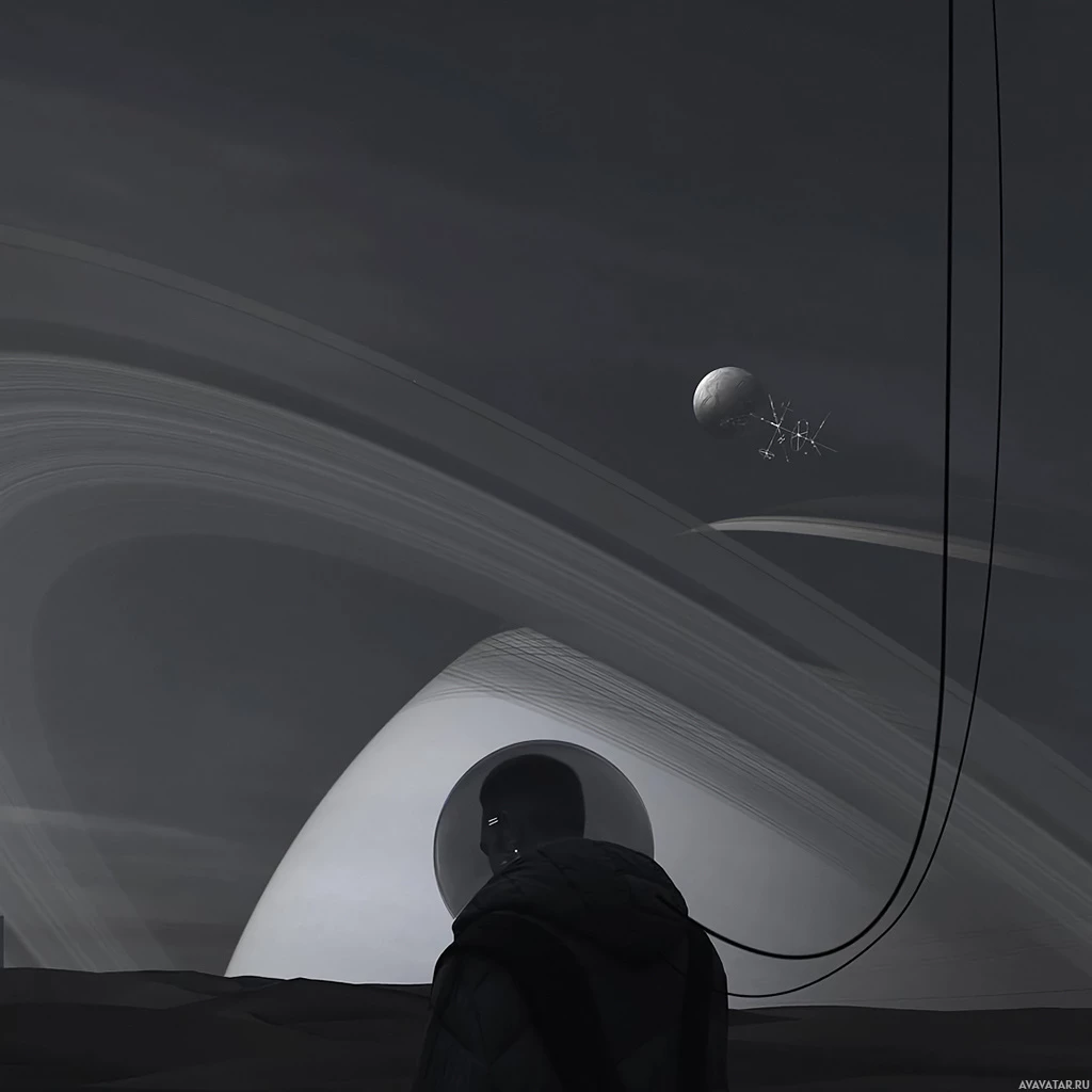 object in the sky that looks like a planet or moon with rings, reminiscent of Saturn. The overall atmosphere is quiet and contemplative, with the person facing away from us, looking out towards this