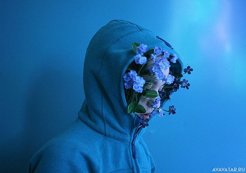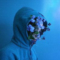long hair and are looking downwards. Flowers with blue petals are scattered throughout the hooded area, creating an artistic and whimsical effect that seems to blend the person's features into