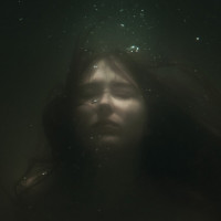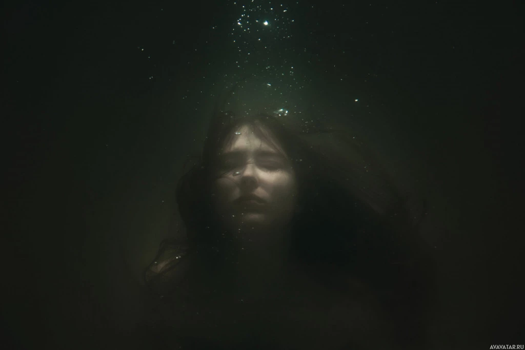 This image features a person submerged in water. The person's head is above the water surface, and it appears as though they are looking upwards with a somewhat