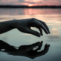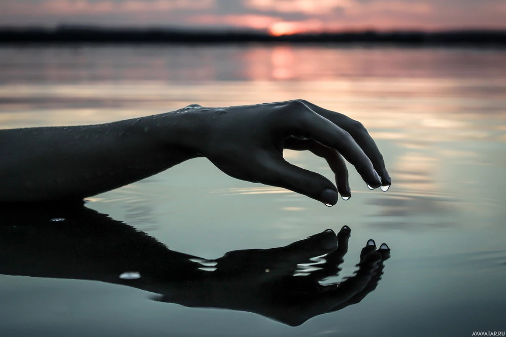 The image shows a hand reaching out of water, with the fingers just touching the surface. The water appears to be still and calm. The background features what looks like a sunset or sunrise with warm colors in the sky, suggesting it might be at