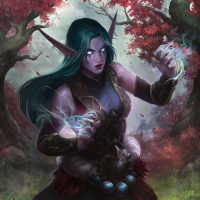 На картинке изображен фэнтезийный персонаж с бирюзовыми волосами, что является общей характеристикой для дронов во вселенной Warcraft. Этот персонаж кажется колдуном или магом, учитывая жесты рук, которые предполагают заклинания. Сцена включает в себя деревья с красными листьями и туманными элементами, которые добавляют мистическую атмосферу сцены.