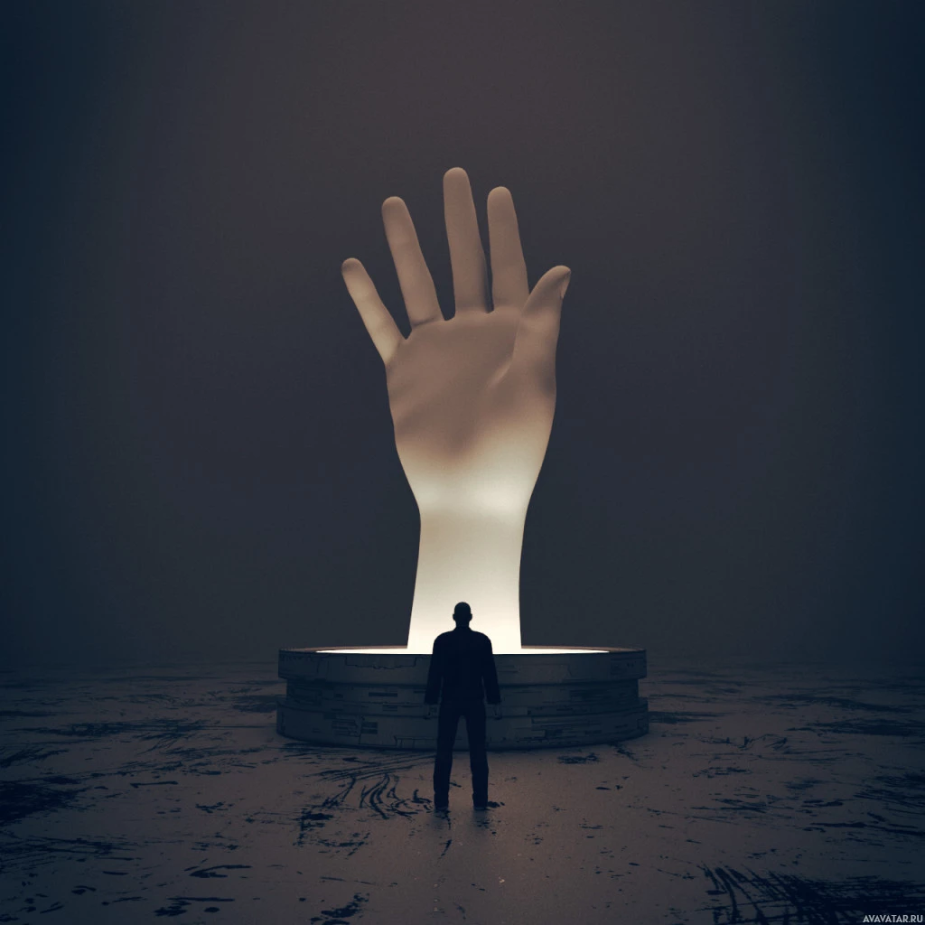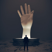 an outstretched hand with fingers curled as if reaching towards something, possibly symbolizing an attempt to grasp or reach for something beyond one's grasp. The background is minimalistic and dark, which contrasts with the light source illuminating the hand statue from behind, creating