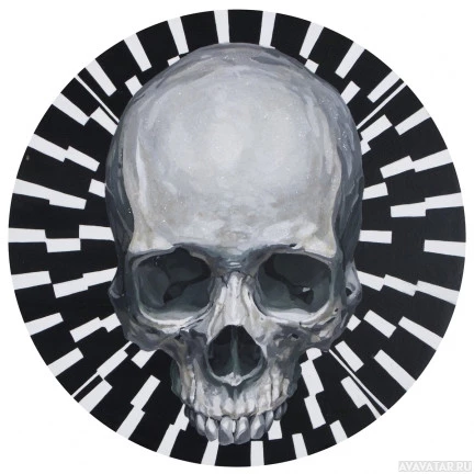 Изображение имеет изображение человеческого черепа. Фон состоит из концентрических кругов, которые создают впечатление движения или вибрации, возможно, представляющих звуковые волны или психоделический эффект. На картинке нет текста или личной информации.
