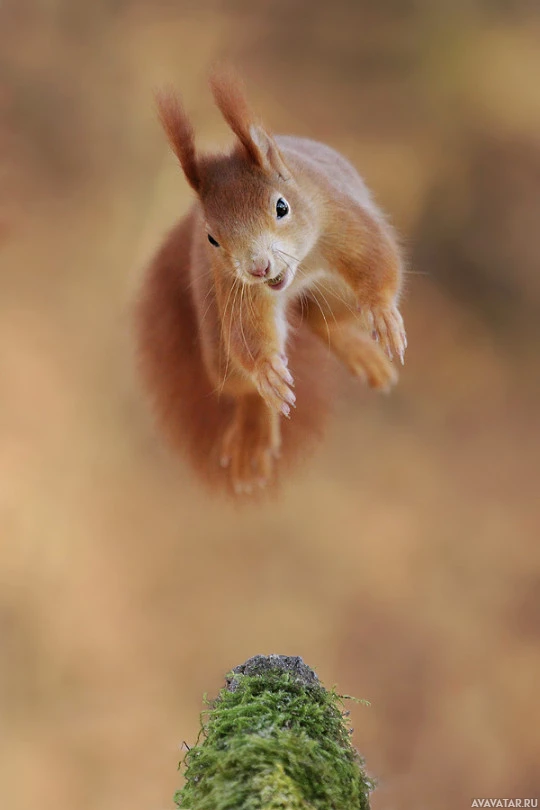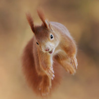 The image shows a squirrel mid-air, likely in the process of jumping from one spot to another. It appears to be in motion with its body fully extended and tail curled upwards, which is typical for squirrels when they are leaping or running through their