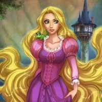 nature of the scene. In the background, there is a tower that resembles Rapunzel's