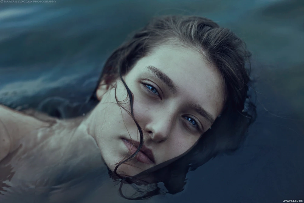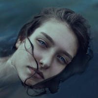dark hair that is wet from being underwater. The overall mood of the picture seems peaceful or possibly contemplative, as the woman's expression is calm and she does not seem to be looking directly at the camera. The water appears calm with