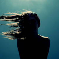 a blue background, possibly water or sky. Her head is turned slightly towards her right, and she has one arm extended as if she might be balancing or reaching out for something. The sun seems to be shining on her hair, giving it