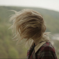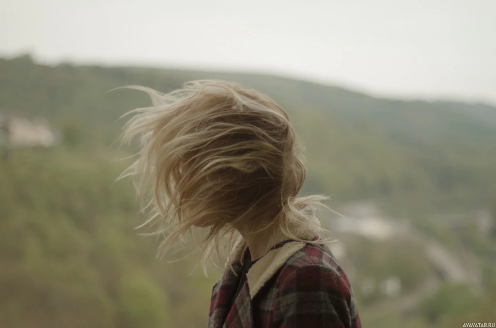 The image shows a person from the back with their hair blowing in the wind. The person appears to be wearing a plaid shirt and is standing outdoors, possibly on a hill or atop a mountain, given