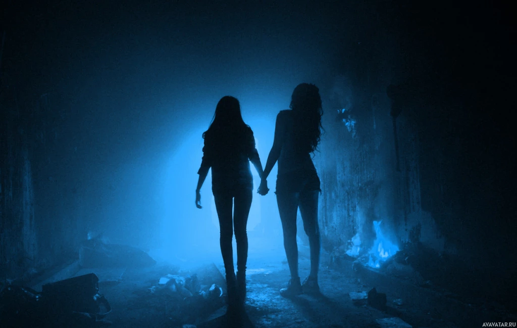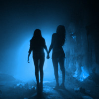 young women set against a dark, eerie background. They appear to be walking closely together with their arms interlocked, creating an impression of companionship or partnership. The lighting is minimal and focuses on the subjects from behind, adding