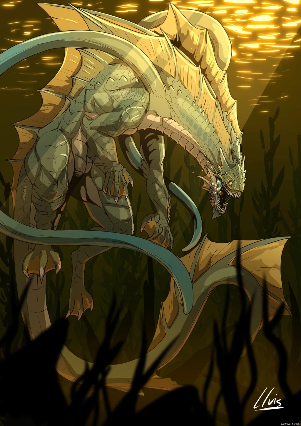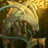a fantasy creature that appears to be a large, serpentine monster with scales and multiple tails. It is situated in