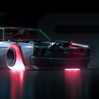 light effect underneath the vehicle that adds to the high-tech feel of the scene. The car appears to be designed for performance or as an artistic statement rather than practicality.