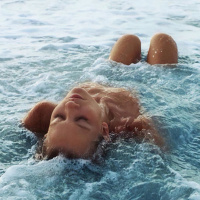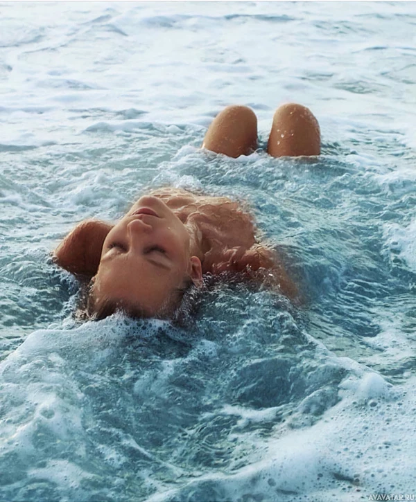 the ocean water. She appears to be relaxed, with her eyes closed and mouth slightly open as if she is enjoying the feeling of floating or resting. Her body is positioned in a way that suggests she might be swimming, but at the moment captured in the image, she seems to be stationary in