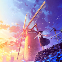 a moment of joy or excitement. Behind her, there's a windmill with a large sail. Below the windmill, a field stretches out, adorned with